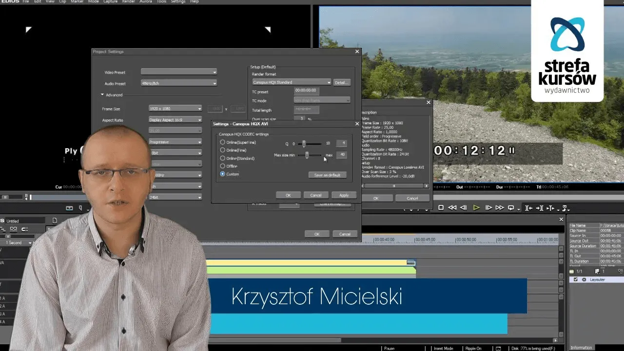 Nauczysz się dobierać właściwe kodeki i ustawienia podczas renderowania dowolnego filmu. Wiedza wyniesiona z kursu pozwoli ci osiągnąć właściwe rezultaty w każdej sytuacji. To czego się nauczysz możesz zastosować w praktyce niezależnie od tego jakiego programu używasz: Edius, Premiere Pro , Sony Vegas, Encore, Pinnacle Studio itd.
