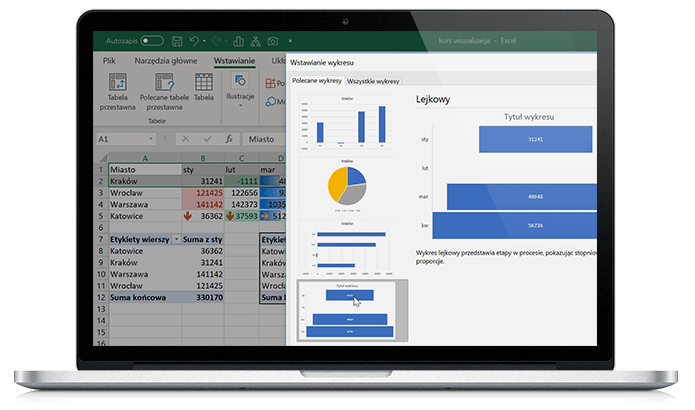 Kurs powstał z myślą o specjalistach do spraw raportowania, controllingu, analitykach, marketingowcach, osobach prowadzących małe i średnie firmy oraz wszystkich, którzy na co dzień pracują z danymi w Excelu i muszą przedstawiać je w graficznej formie. Dzięki temu szkoleniu opanujesz tworzenie i edycję wykresów na przykładach opartych o rzeczywiste problemy, które możesz spotkać w codziennej pracy.