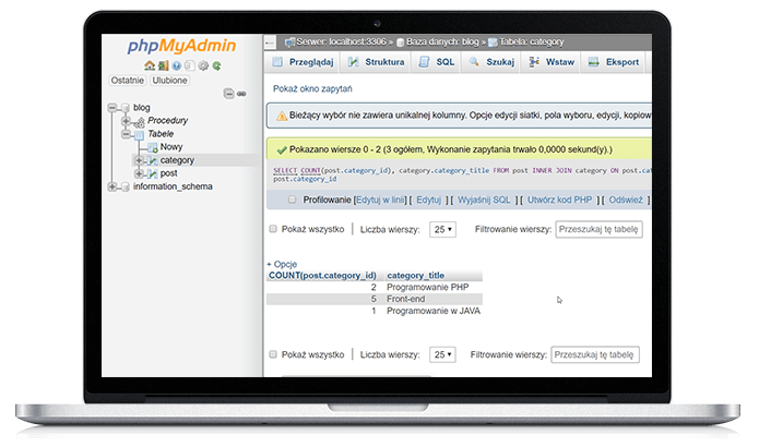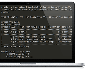Sporą część kursu poświęcimy na omówienie najważniejszych technik pracy z bazą oraz tabelami. Wykorzystując klienta MySQL działającego w terminalu nauczysz się szybko wykonywać wszystkie kluczowe zapytania do bazy. Będziesz w stanie łatwo tworzyć dowolne tabele, wprowadzać do nich dane, modyfikować ich strukturę oraz wyciągać dokładnie takie informacje jakie są Ci w danym momencie potrzebne.