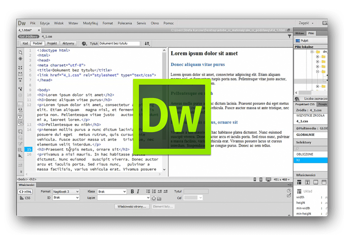 Adobe Dreamweaver od lat wyznacza standardy wśród programów do tworzenia stron internetowych. Program oferuje możliwość pracy w trybie wizualnym a także sprawną edycję kodu. Zapewnia niezwykle bogaty zestaw narzędzi ułatwiających pracę i pozwala na bezproblemową integrację z innymi produktami Adobe. Nasz kurs pozwoli ci w pełni wykorzystać możliwości tego doskonałego programu podczas tworzenia stron internetowych i nie tylko.