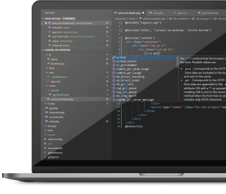 Na samym początku kursu przygotujemy środowisko pracy. Zainstalujemy Composer, który pozwoli łatwo zarządzać zależnościami i skonfigurujemy edytor Visual Studio Code. Od razu przystąpimy też do konfigurowania naszej pierwszej aplikacji. Poznasz narzędzia Laravel i dowiesz się, jak z nich korzystać w praktyce. Zobaczysz, jak działa tzw. kontener serwisów oraz czym są fasady i kontrakty. Zrozumiesz też, co dzieje się na zapleczu, gdy Laravel zajmuje się przetwarzaniem żądania.