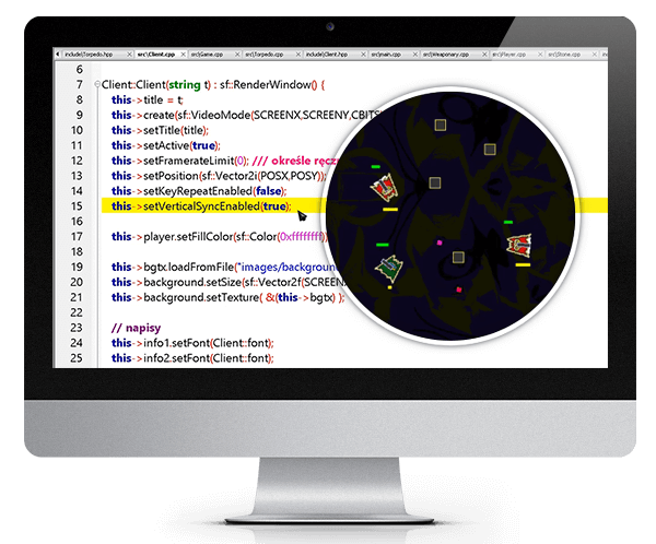 Uzbrojony w taką konkretną i kompleksową wiedzę będziesz mógł przejść do ćwiczeń praktycznych z projektowanie i tworzenia gier. Wspólnie ze mną stworzysz 2 produkcje. Pierwsza to klasyczna strzelanka w klimatach “Space Invaders”. Będzie ona okazją do utrwalenia technik symulacji fizyki i kolizji, nauczysz się generować i usuwać dużą liczbę obiektów oraz wzbogacać grę o efekty audio. W drugiej grze stworzysz rozgrywkę wieloosobową stosując techniki synchronizacji danych oraz wielowątkowość.