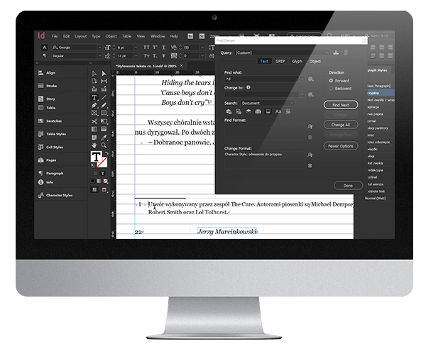 To jeden z najważniejszych etapów naszej pracy, dlatego w kursie pojawił się obszerny rozdział jemu poświęcony. Style akapitowe i znakowe to nieodzowne narzędzia składu. Pokażę jak się nimi posługiwać oraz jak zachować tzw. przesłonięcia lokalne w tekście za pomocą dosłownie jednego skrótu klawiaturowego. Zobaczysz również jak prawidłowo sformatować przypisy czy zaprojektować tzw. "czwórkę tytułową". Zajmiemy się również czyszczeniem tekstu po jego wlaniu do dokumentu. Pokażę ci moje sprawdzone sposoby usuwania z tekstu niepotrzebnych znaków i błędów jakie mogą pojawić się przy imporcie z edytora tekstowego.