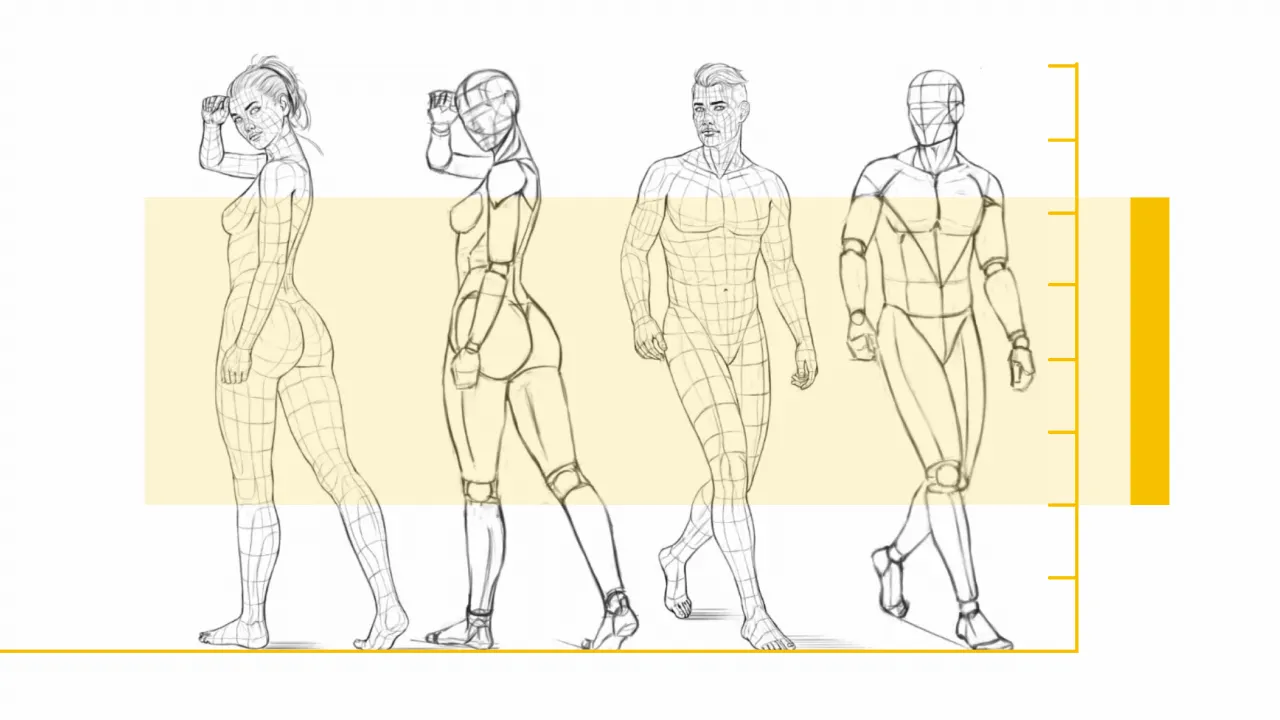 W tej części kursu poznasz zasady dotyczące poprawnego rozrysowywania poszczególnych części ciała człowieka, ze szczególnym uwzględnieniem poprawności anatomicznej. Pokażę Ci jak zachować odpowiednie proporcje i na jakie różnice zwrócić szczególną uwagę rysując sylwetkę męską oraz żeńską. W trakcie kursu nauczysz się szkicować poszczególne elementy ciała takie jak szyja, korpus, ręce, dłonie, nogi i stopy i poznasz proste techniki i zasady, które pozwolą Ci na szybkie tworzenie szkiców części ciała człowieka, z wykorzystaniem wyłącznie prostych form.