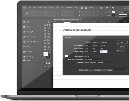 W trakcie kursu liczne przykłady typografii i techniki pracy pokazuję w programie Adobe InDesign. Aby skorzystać w pełni z przekazywanej przez mnie wiedzy przydatne będą więc podstawowe umiejętności pracy w tym programie. Jeżeli jeszcze ich nie posiadasz, możesz uzupełnić brakującą wiedzę, dzięki naszemu szkoleniu z podstaw obsługi Adobe InDesign.